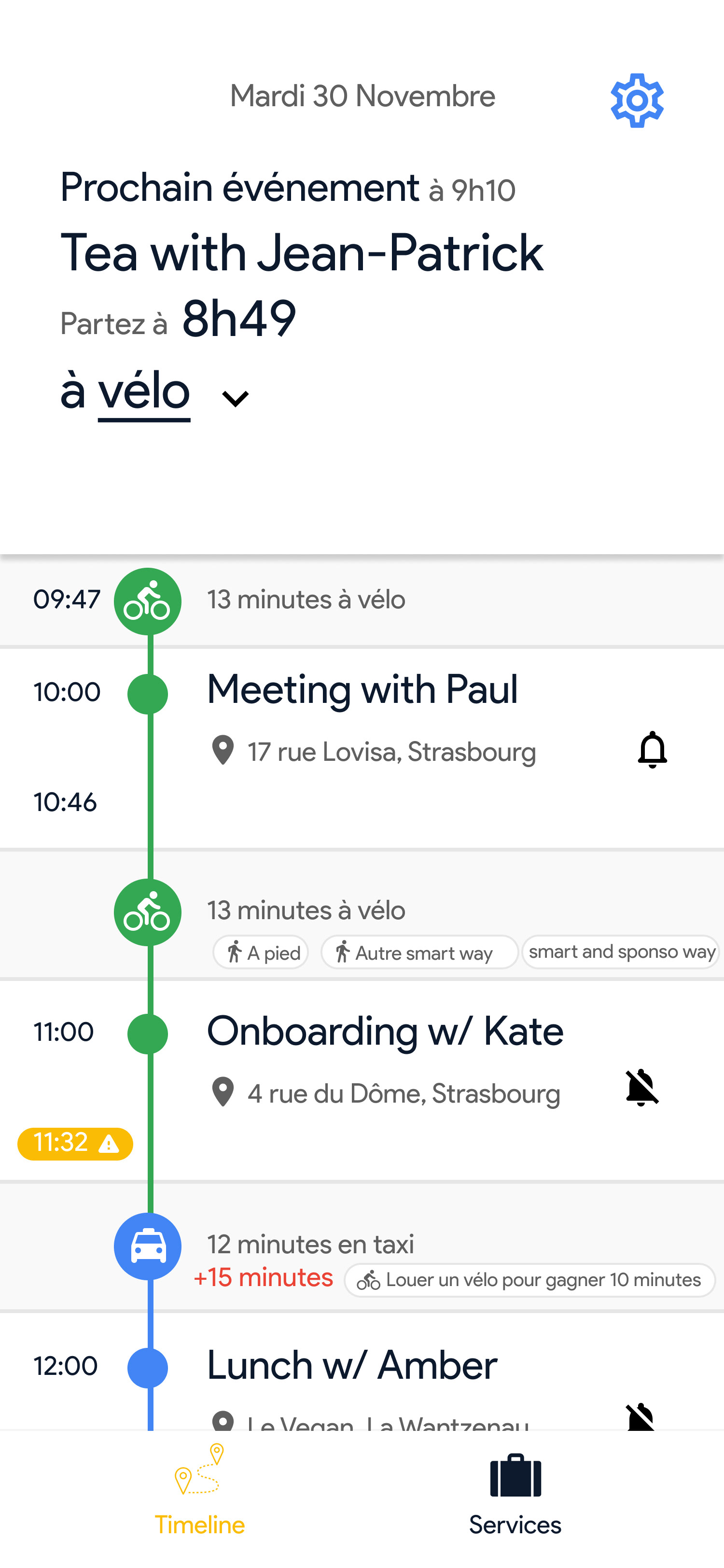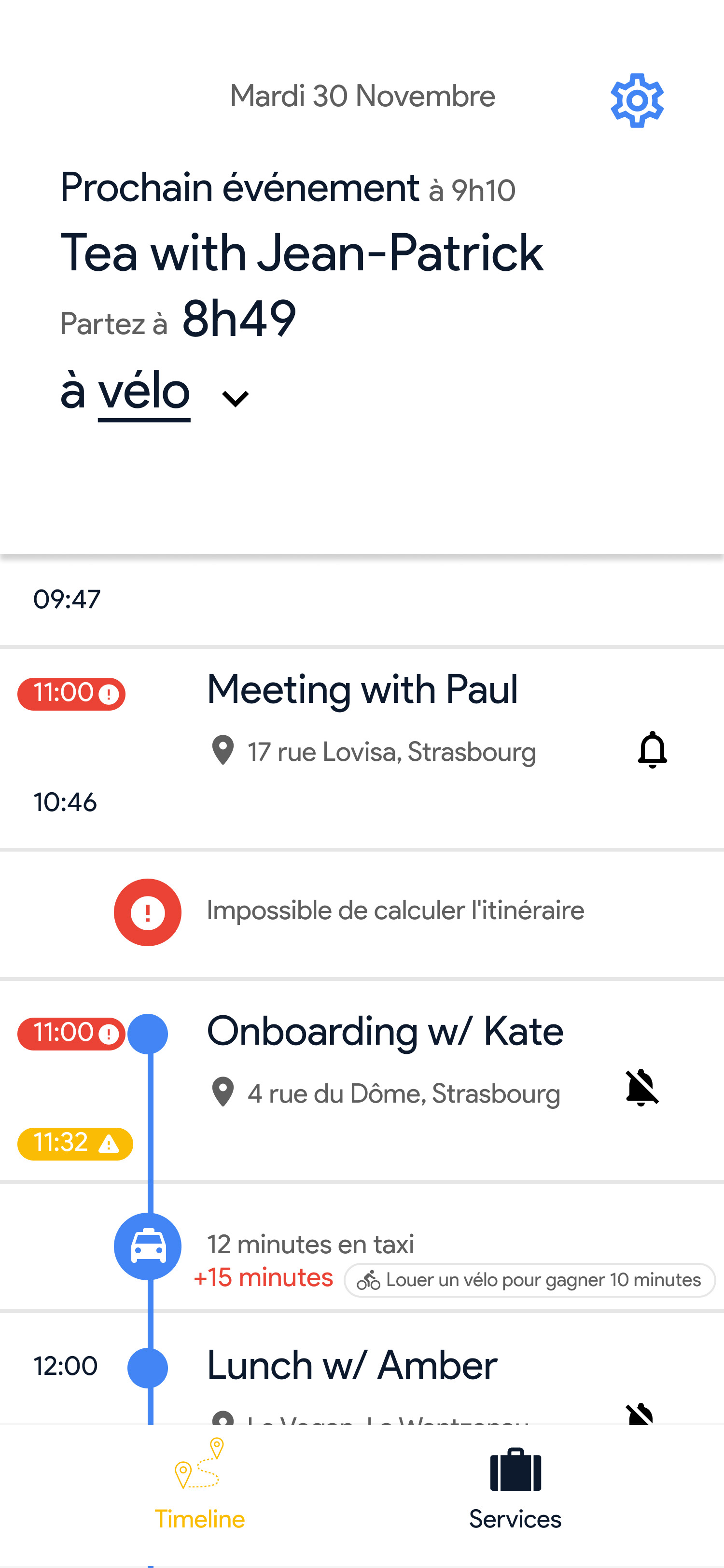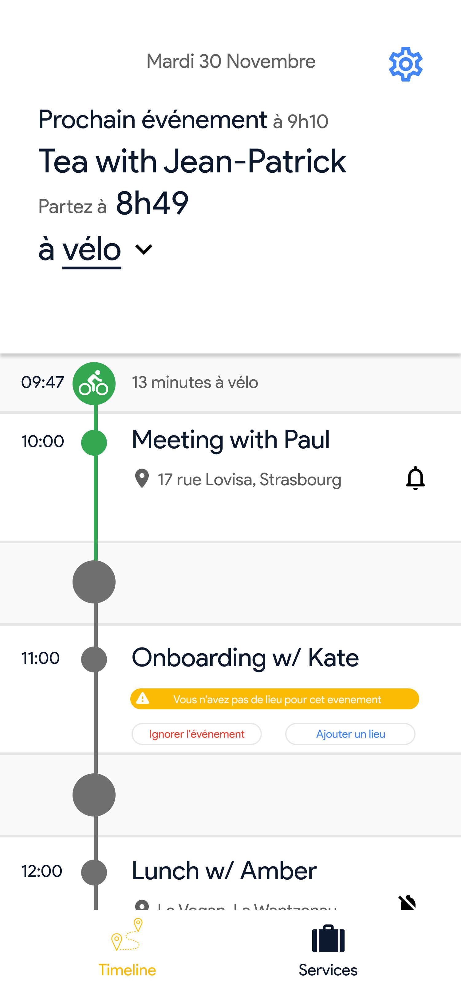 Voici l'onglet principal de l'application•La timeline avec les événements de votre calendrier